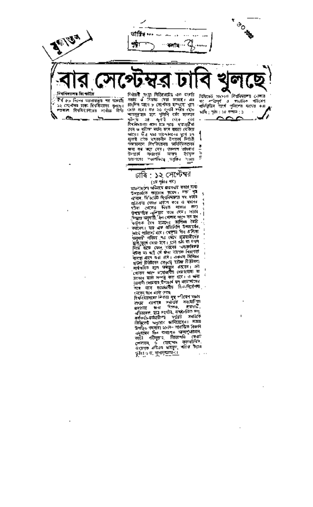 ১২ সেপ্টেম্বর ঢাবি খুলছে