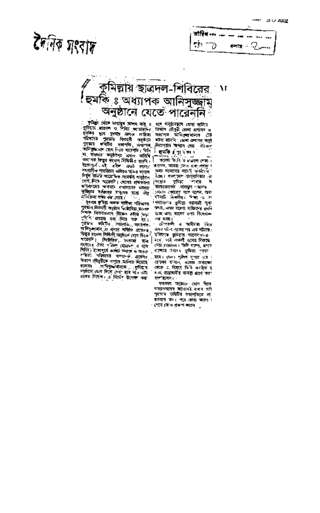 কুমিল্লায় ছাত্রদল-শিবিরের হুমকিঃ অধ্যপক আনিসুজ্জাম অনুষ্ঠানে যেতে পারেননি