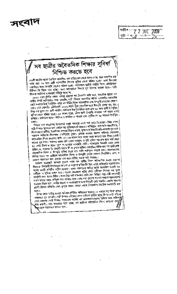 সব ছাত্রীর অবৈতনিক শিক্ষার সুবিধা নিশ্চিত করতে হবে Published on Newspaper দৈনিক সংবাদ Category Women Education Download
