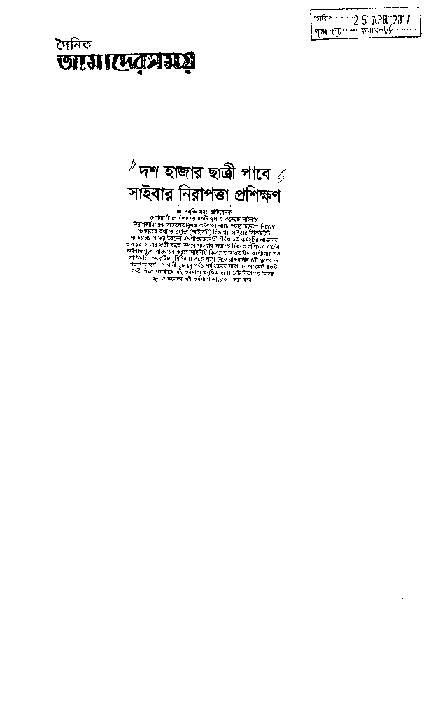 দশ হাজার ছাত্রী পাবে সাইবার নিরাপত্তা প্রশিক্ষণ Published on Newspaper দৈনিক আমাদের সময় Category ICT Education Download