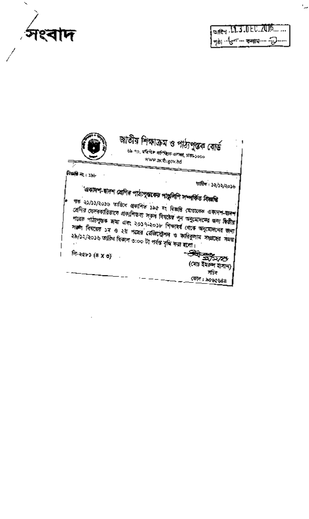 একাদশ-দ্বাদশ শ্রেণির পাঠ্যপুস্তক পাণ্ডুলিপি সম্পর্কিত বিজ্ঞপ্তি Published on Newspaper দৈনিক সংবাদ Category Educational Ministry / Departments Education Board NCTB Education Ministry / Division / Directorate Download