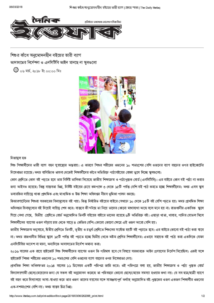 শিশুর কাঁধে অনুমোদনহীন বইয়ের ভারী ব্যাগ _ প্রথম পাতা _ The Daily Ittefaq Published on Newspaper দৈনিক ইত্তেফাক Category Child Education Download