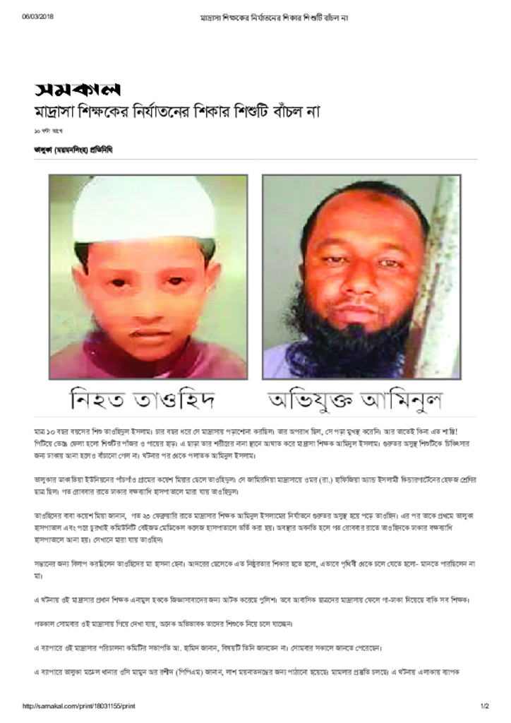 মাদ্রাসা শিক্ষকের নির্যাতনের শিকার শিশুটি বাঁচল না