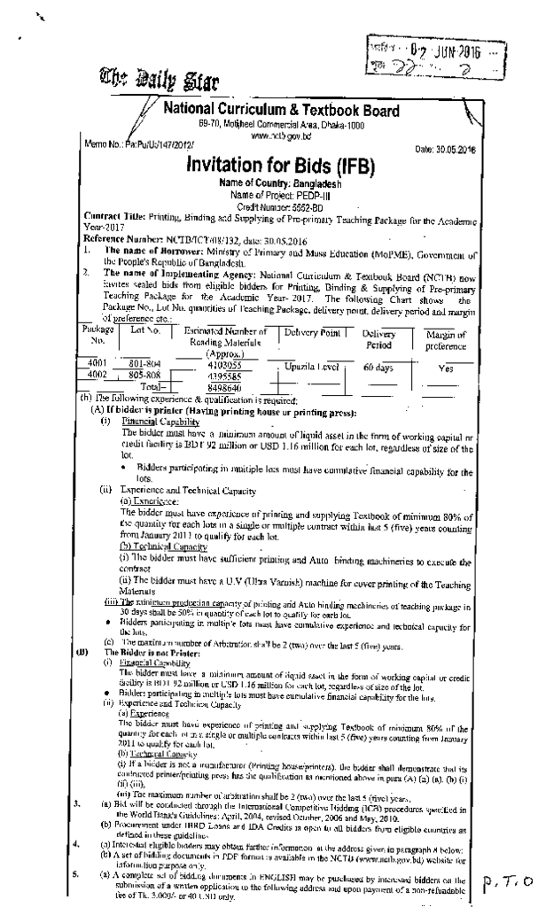 National Curriculum Textbook Board // Invitation for Bids (IFB) Published on Newspaper The Daily Star Category Educational Ministry / Departments Education Board NCTB Education Ministry / Division / Directorate Download