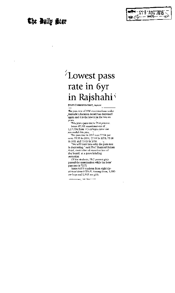 Lowest pass rate in 6yr in Rajshahi Published on Newspaper The Daily Star Category Public Examination Public Examination HSC Download