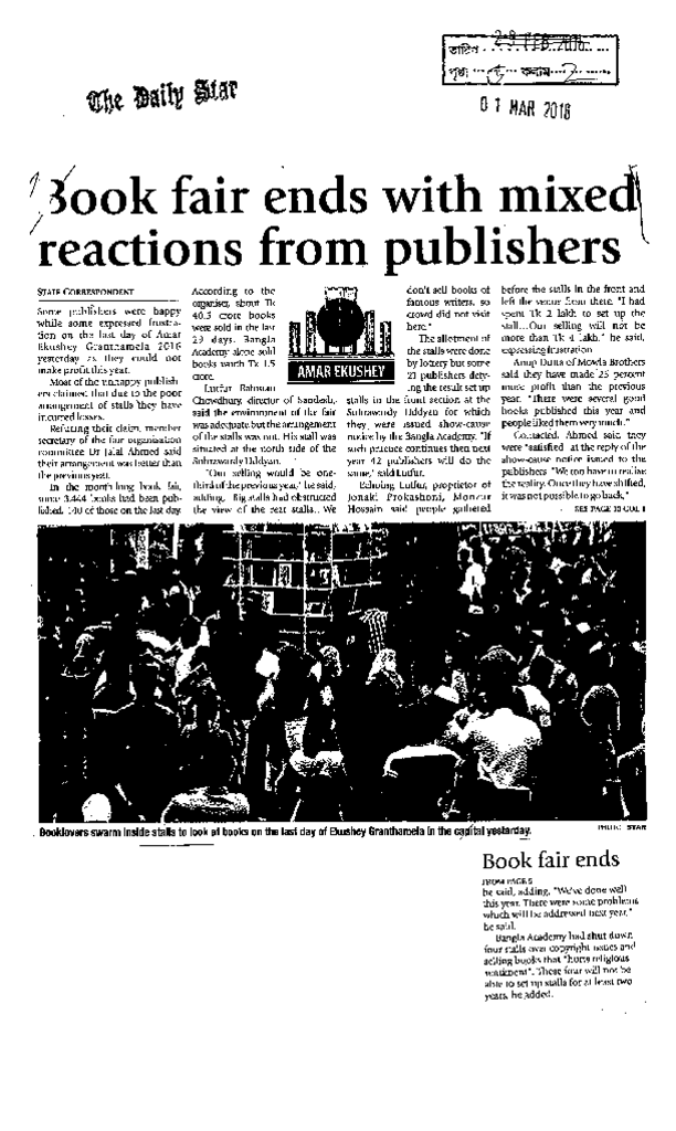 Book fair ends with mixed reactions from publishers Published on Newspaper The Daily Star Category Book Fair Download