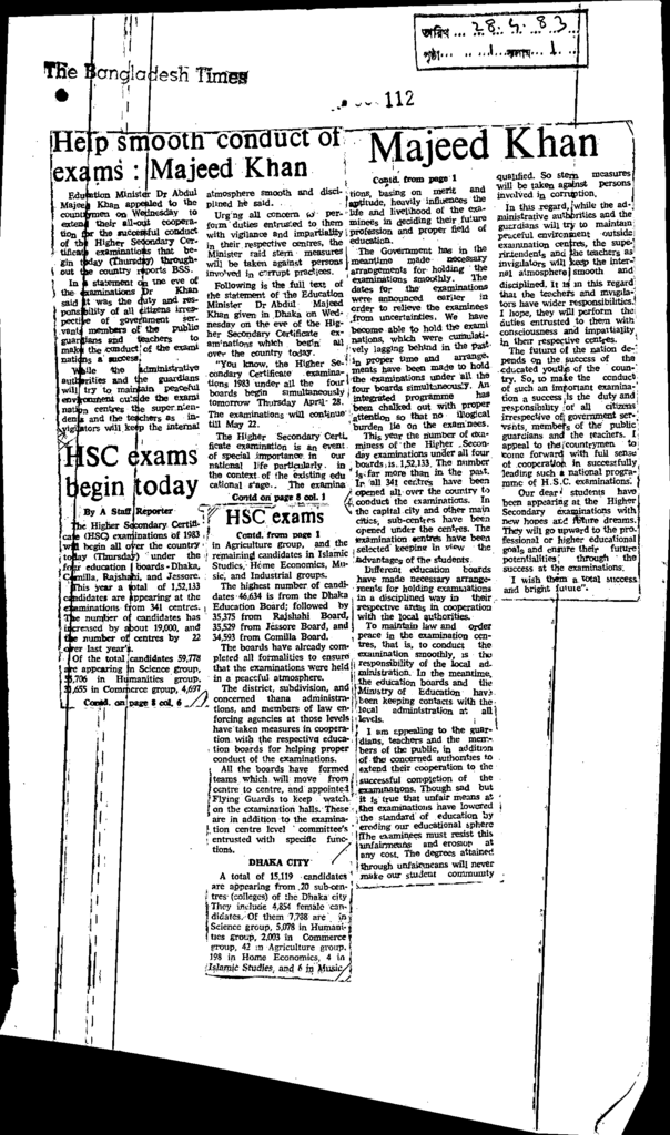 Help smooth conduct of exams :Majeed Khan Published on Newspaper The Bangladesh Times Category Admission / Seat Problem Download