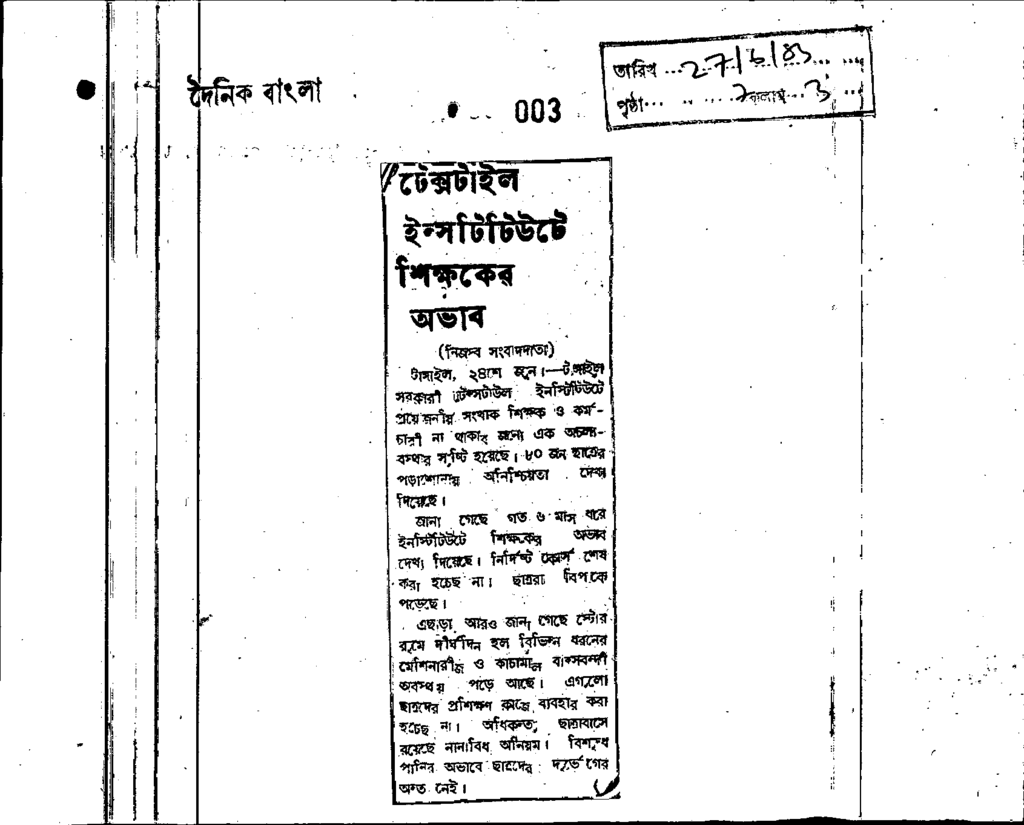 টেক্সটাইল ইন্সটিটিউটে শিক্ষকের অভাব