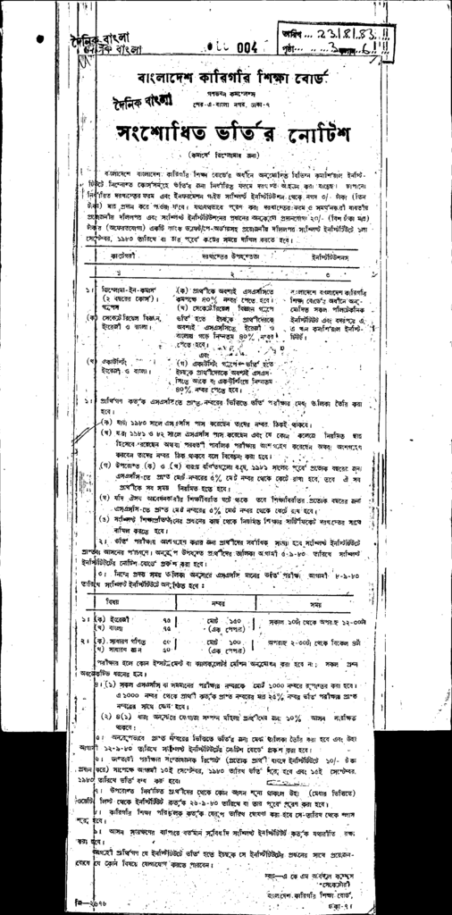 বাংলাদেশ কারিগরি শিক্ষা বোর্ড সংশোধিত ভতির্র নোটিশ