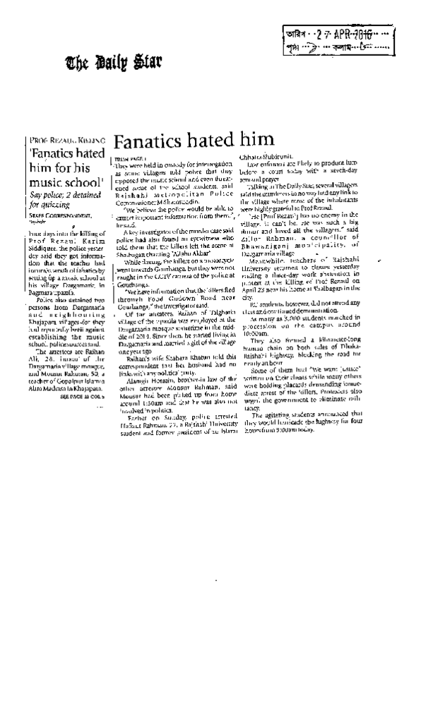 Fanatics hated him for his music school Published on Newspaper The Daily Star Category Campus Terrorism Download