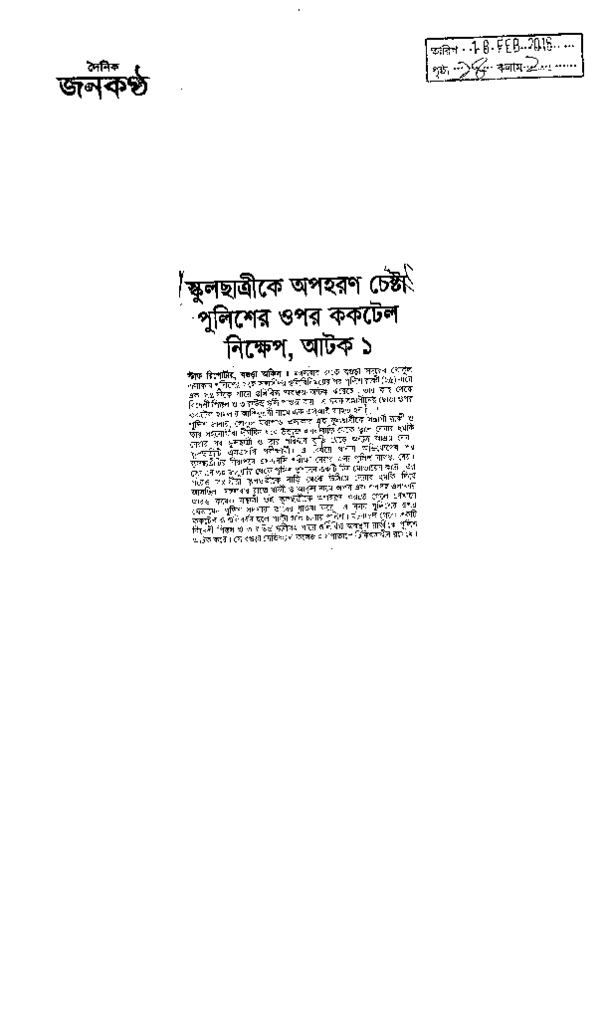স্কুলছাত্রীকে অপহরণ চেষ্টা পুলিশের ওপর ককটেল নিক্ষেপ, আটক ১ Published on Newspaper দৈনিক জনকণ্ঠ Category Campus Terrorism Download
