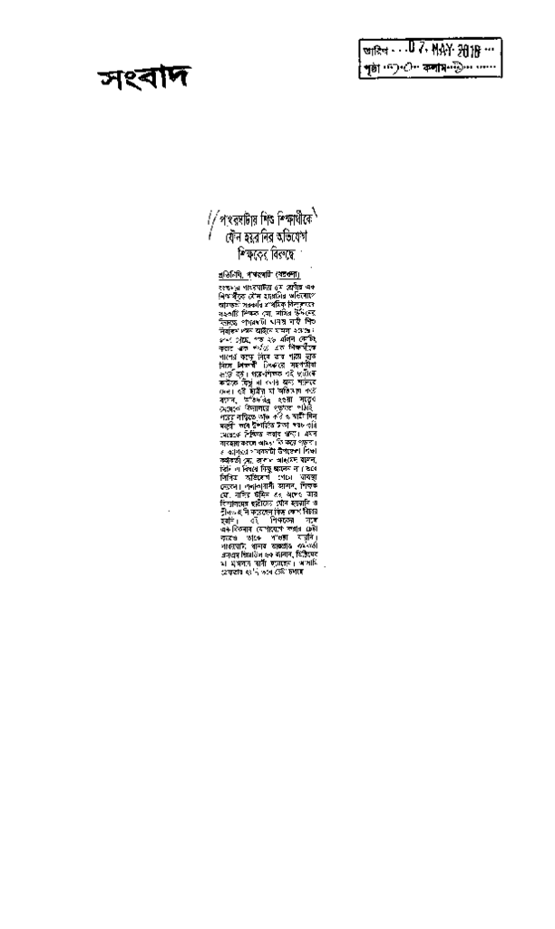 পাথরঘাটায় শিশু শিক্ষার্থীকে যৌন হয়রানির অভিযোগ শিক্ষকের বিরুদ্ধে Published on Newspaper দৈনিক সংবাদ Category Campus Terrorism Download