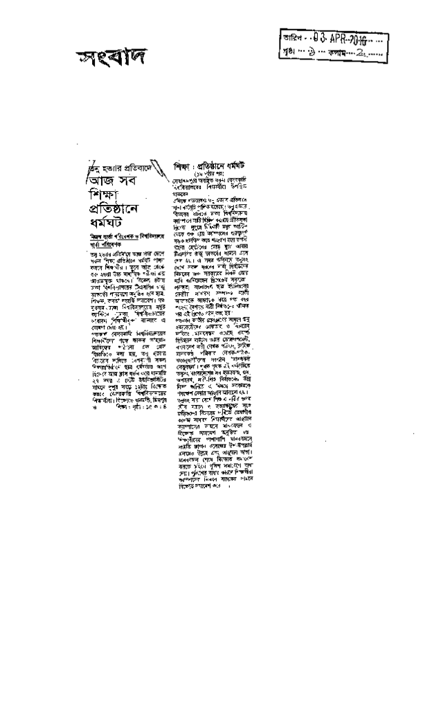 আজ সব শিক্ষা প্রতিষ্ঠানে ধর্মঘট Published on Newspaper দৈনিক সংবাদ Category Campus Terrorism Download