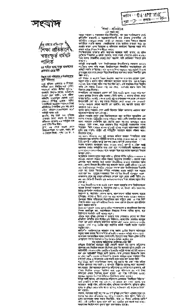 শিক্ষা প্রতিষ্ঠানে স্বতঃস্ফূর্ত ধর্মঘট পালিত Published on Newspaper দৈনিক সংবাদ Category Campus Terrorism Download