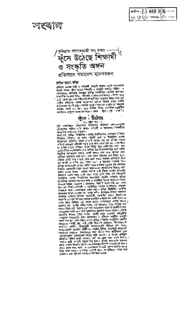 ফুঁসে উঠেছে শিক্ষার্থী ও সংস্কৃতি অঙ্গন Published on Newspaper দৈনিক সংবাদ Category Campus Terrorism Download