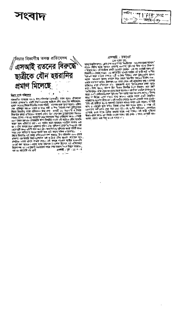 এসআই রতনের বিরুদ্ধে ছাত্রীকে যৌন হয়রানির প্রমাণ মিলেছে Published on Newspaper দৈনিক সংবাদ Category Campus Terrorism Download