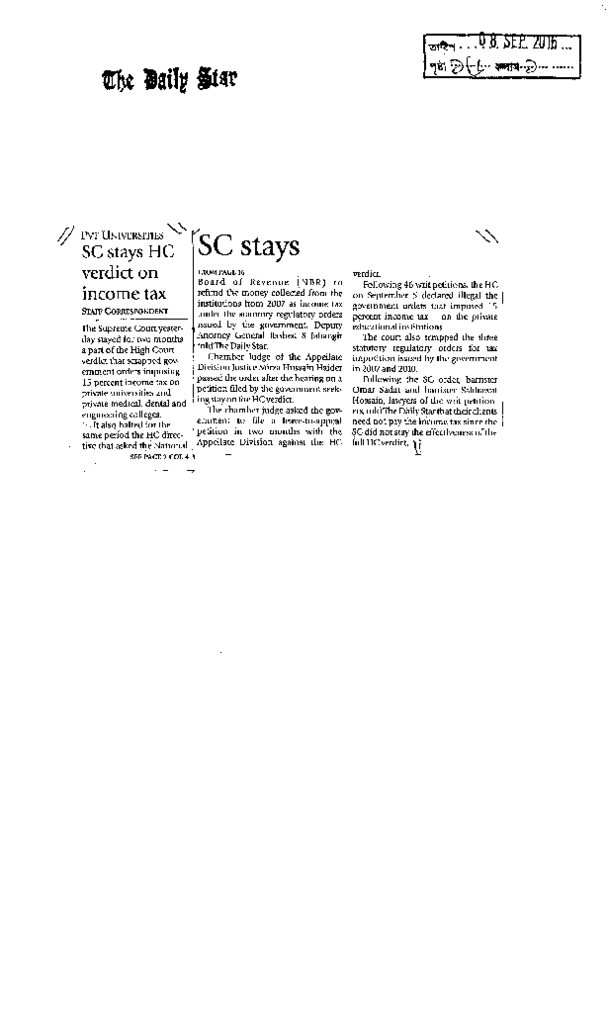 SC stays HC ervict on income tax Published on Newspaper The Daily Star Category General Education General Education Higher Education Private Download