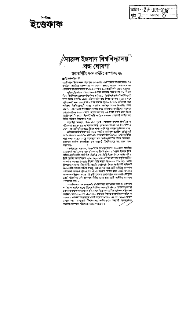 দারুল ইহসান বিশ্ববিদ্যালয় বন্ধ ঘোষণা Published on Newspaper দৈনিক ইত্তেফাক Category General Education General Education Higher Education Private Download