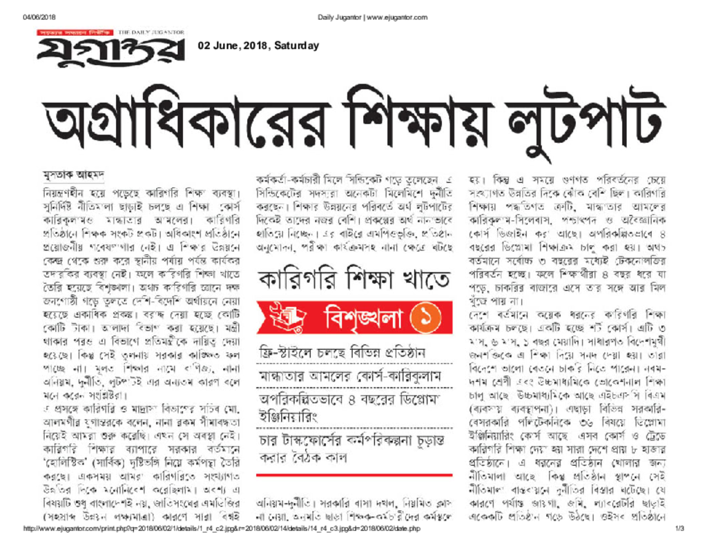 অগ্রাধিকারের শিক্ষায় লুটপাট-কারিগরী Published on Newspaper দৈনিক যুগান্তর Category Technical and Vocational Education Download