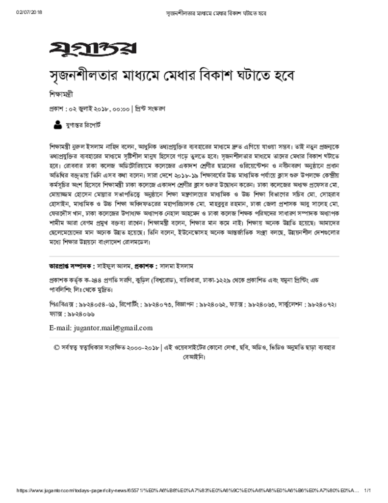 সৃজনশীলতার মাধ্যমে মেধার বিকাশ ঘটাতে হবে Published on Newspaper দৈনিক যুগান্তর Category Personal Opinion / Discussion / Commentary Personal Speech / Discussion / Comentary Secondary and Higher Secondary Education Download