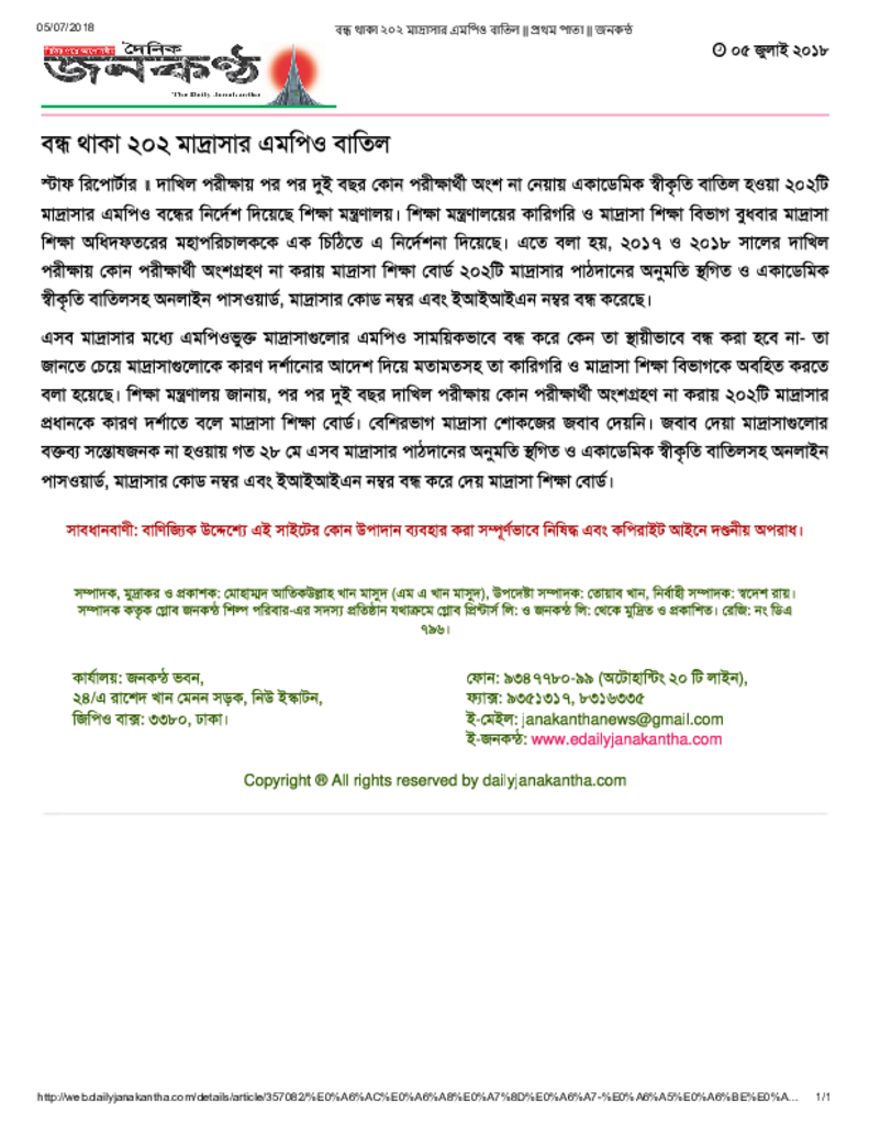 বন্ধ থাকা ২০২ মাদ্রাসার এমপিও বাতিল __ প্রথম পাতা __ জনকন্ঠ Published on Newspaper দৈনিক জনকণ্ঠ Category Educational Ministry / Departments Education Ministry / Division / Directorate Madrasah Education Alia Download