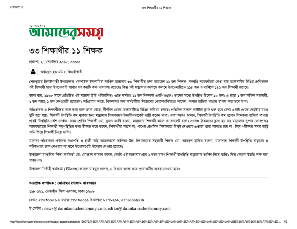 ৩৩ শিক্ষার্থীর ১১ শিক্ষক Published on Newspaper দৈনিক আমাদের সময় Category Madrasah Education Download