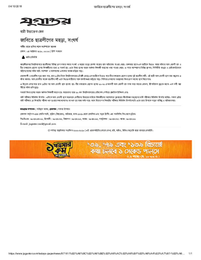 জাবিতে ছাত্রলীগের মহড়া, সংঘর্ষ Published on Newspaper দৈনিক যুগান্তর Category Campus Terrorism Download
