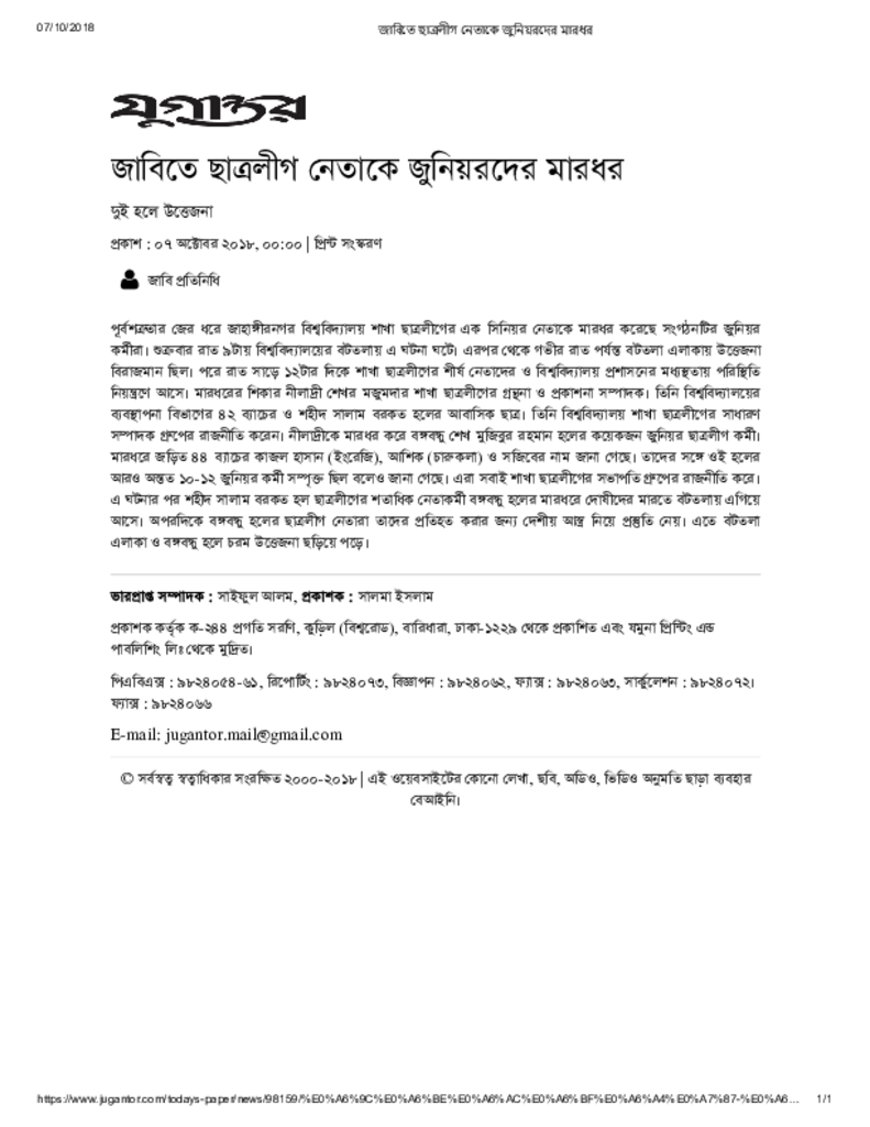 জাবিতে ছাত্রলীগ নেতাকে জুনিয়রদের মারধর Published on Newspaper দৈনিক যুগান্তর Category Campus Terrorism Download