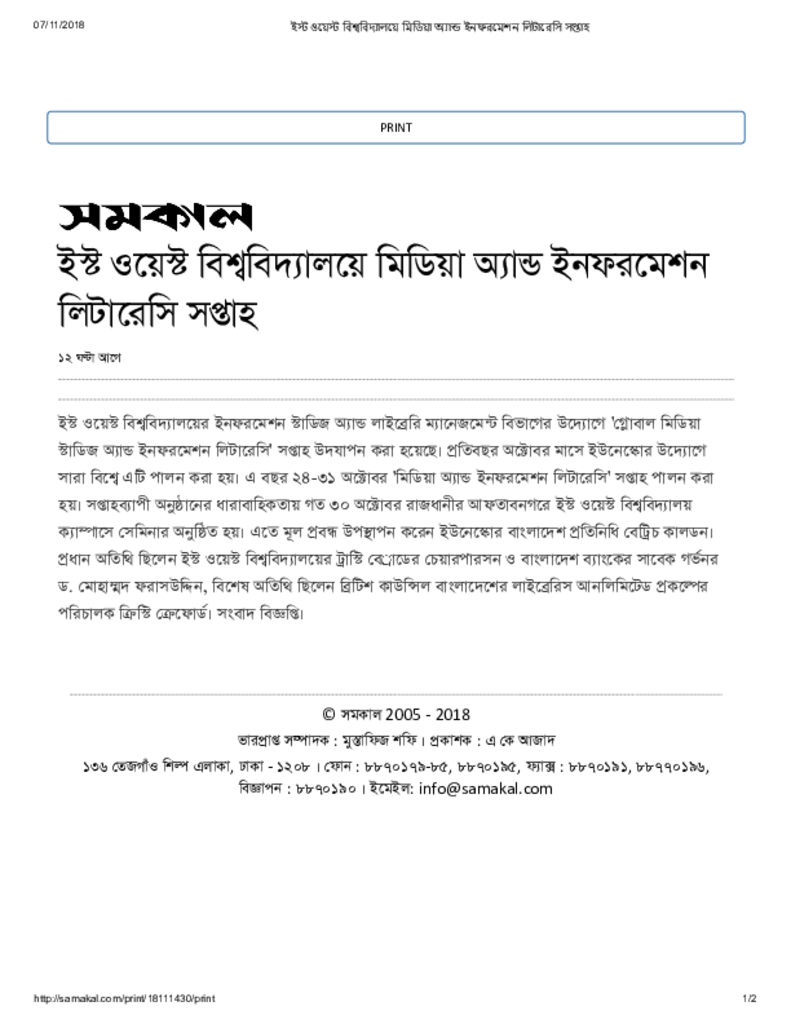 ইস্ট ওয়েস্ট বিশ্ববিদ্যালয়ে মিডিয়া অ্যান্ড ইনফরমেশন লিটারেসি সপ্তাহ Published on Newspaper দৈনিক সমকাল Category General Education General Education Higher Education Private Download