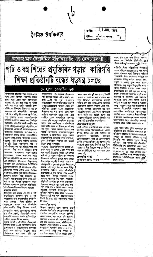 পাট ও বস্ত্র শিল্পের প্রযুক্তিবিদ গড়ার কারিগরি শিক্ষা প্রতিষ্ঠানটি বন্ধের ষড়যন্ত্র চলছে Published on Newspaper দৈনিক ইনকিলাব Category Technical and Vocational Education Download