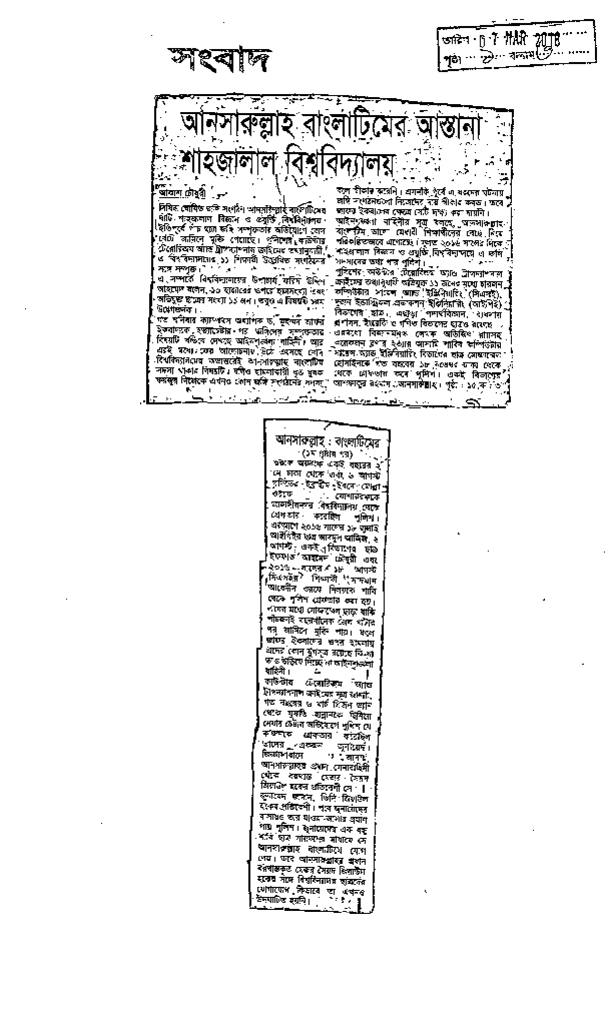 আনসারুল্লাহ বাংলা টিমের আস্তানা শাহজালাল বিশ্ববিদ্যালয় Published on Newspaper দৈনিক সংবাদ Category Campus Terrorism Download