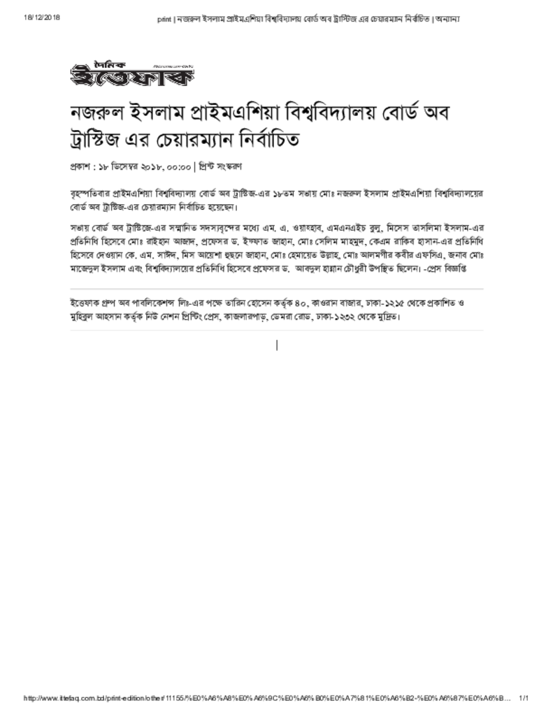 print _ নজরুল ইসলাম প্রাইমএশিয়া বিশ্ববিদ্যালয় বোর্ড অব ট্রাস্টিজ এর চেয়ারম্যান নির্বাচিত _ অন্যান্য