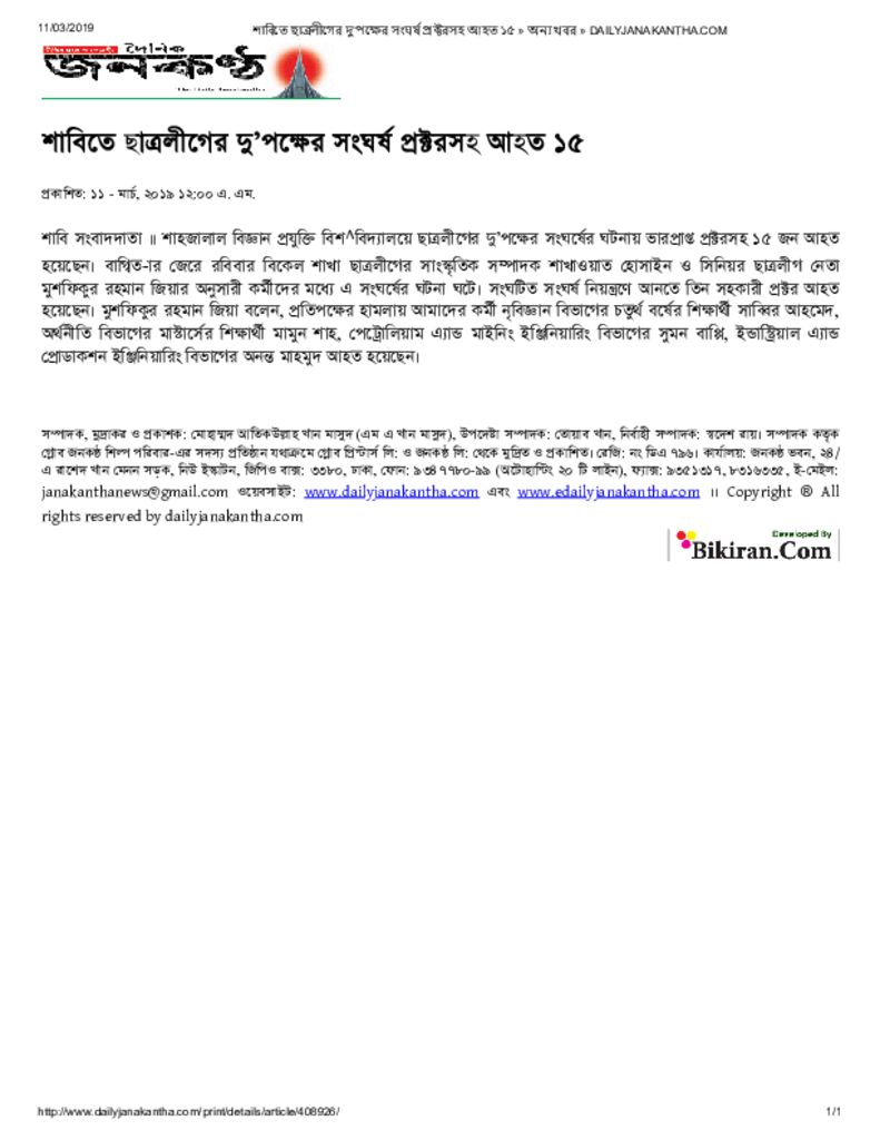 শাবিতে ছাত্রলীগের দু’পক্ষের সংঘর্ষ প্রক্টরসহ আহত ১৫ » অন্য খবর » DAILYJANAKANTHA.COM Published on Newspaper দৈনিক জনকণ্ঠ Category Campus Terrorism Download