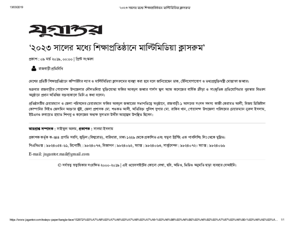 ‘২০২৩ সালের মধ্যে শিক্ষাপ্রতিষ্ঠানে মাল্টিমিডিয়া ক্লাসরুম’ Published on Newspaper দৈনিক যুগান্তর Category ICT Education Download