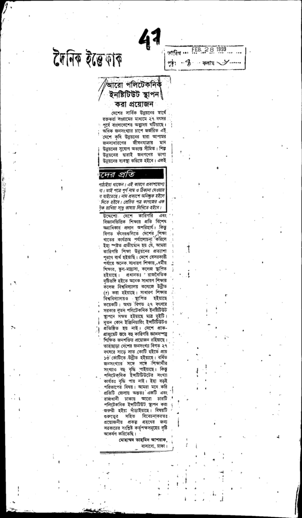 আরো পলিটেকনিক ইনষ্টিটিউট স্থাপন করা প্রয়োজন Published on Newspaper দৈনিক ইত্তেফাক Category Technical and Vocational Education Download