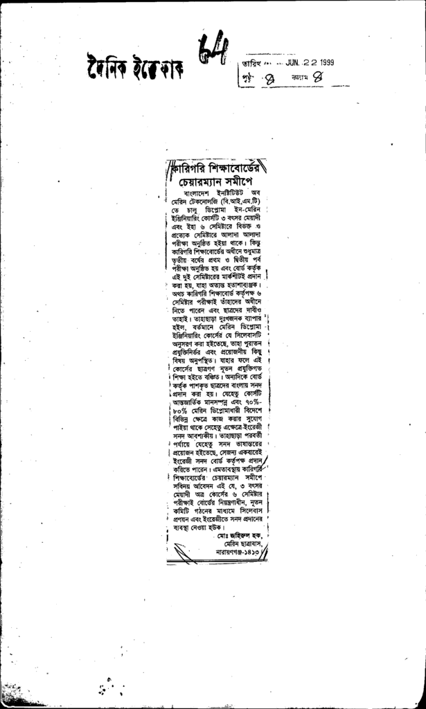 কারিগরি শিক্ষাবের্ডের য়োরম্যান সমীপে Published on Newspaper দৈনিক ইত্তেফাক Category Technical and Vocational Education Download
