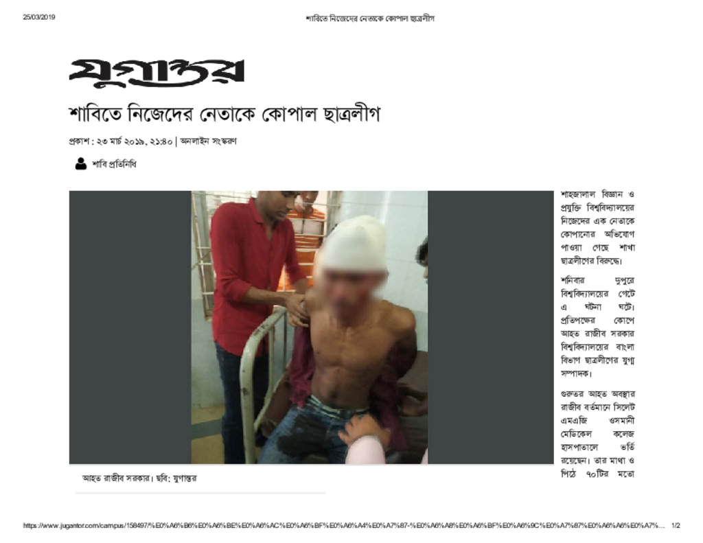 শাবিতে নিজেদের নেতাকে কোপাল ছাত্রলীগ Published on Newspaper দৈনিক যুগান্তর Category Campus Terrorism Download