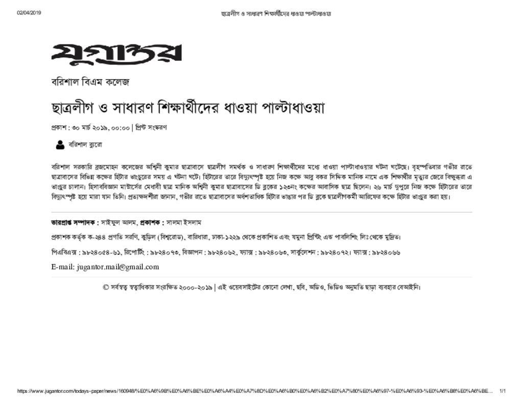 ছাত্রলীগ ও সাধারণ শিক্ষার্থীদের ধাওয়া পাল্টাধাওয়া Published on Newspaper দৈনিক যুগান্তর Category Campus Terrorism Download