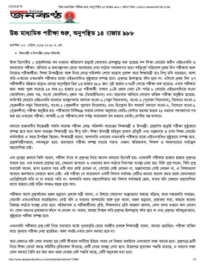 উচ্চ মাধ্যমিক পরীক্ষা শুরু, অনুপস্থিত ১৪ হাজার ৯৮৮ » প্রথম পাতা » DAILYJANAKANTHA.COM Published on Newspaper দৈনিক জনকণ্ঠ Category Public Examination Public Examination HSC Download