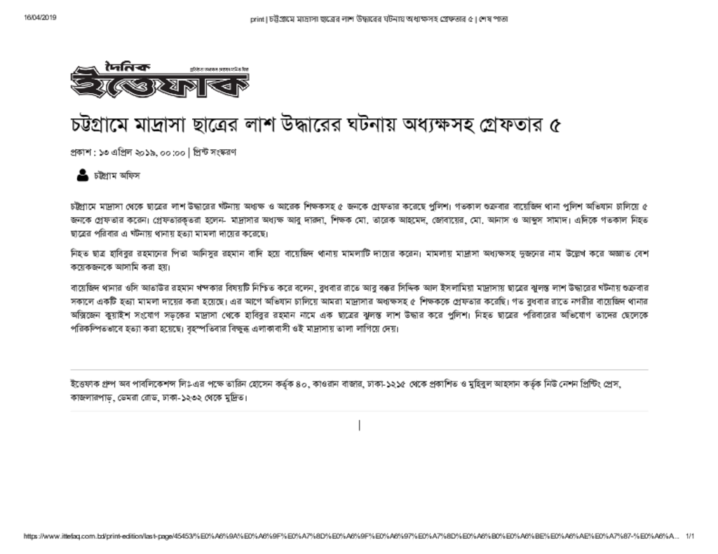 print _ চট্টগ্রামে মাদ্রাসা ছাত্রের লাশ উদ্ধারের ঘটনায় অধ্যক্ষসহ গ্রেফতার ৫ _ শেষ পাতা Published on Newspaper দৈনিক ইত্তেফাক Category Madrasah Education Download