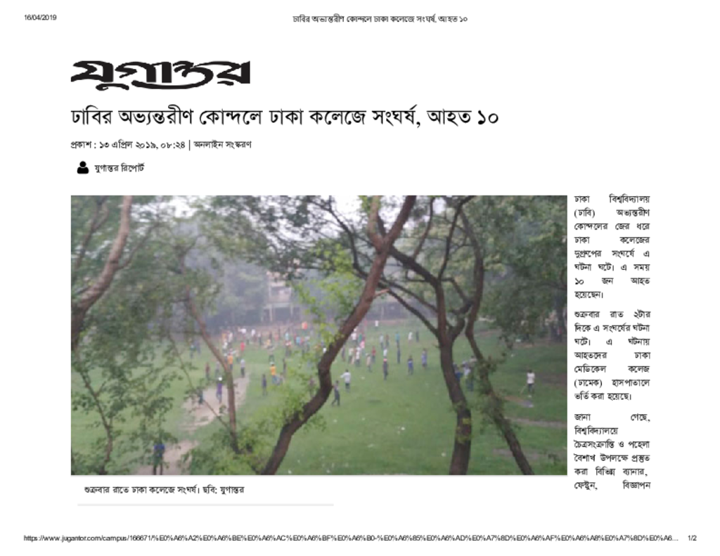 ঢাবির অভ্যন্তরীণ কোন্দলে ঢাকা কলেজে সংঘর্ষ, আহত ১০ Published on Newspaper দৈনিক যুগান্তর Category Campus Terrorism Download