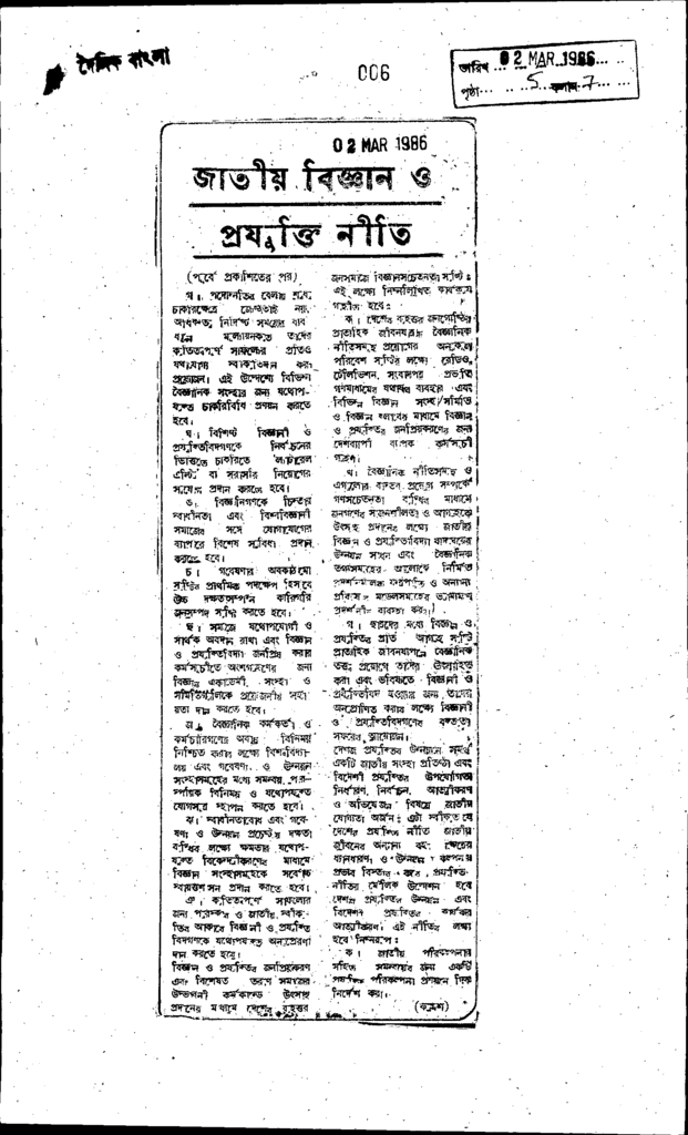 জাতীয় বিজ্ঞান ও প্রযুক্তি নীতি Published on Newspaper দৈনিক বাংলা Category Science Education Download