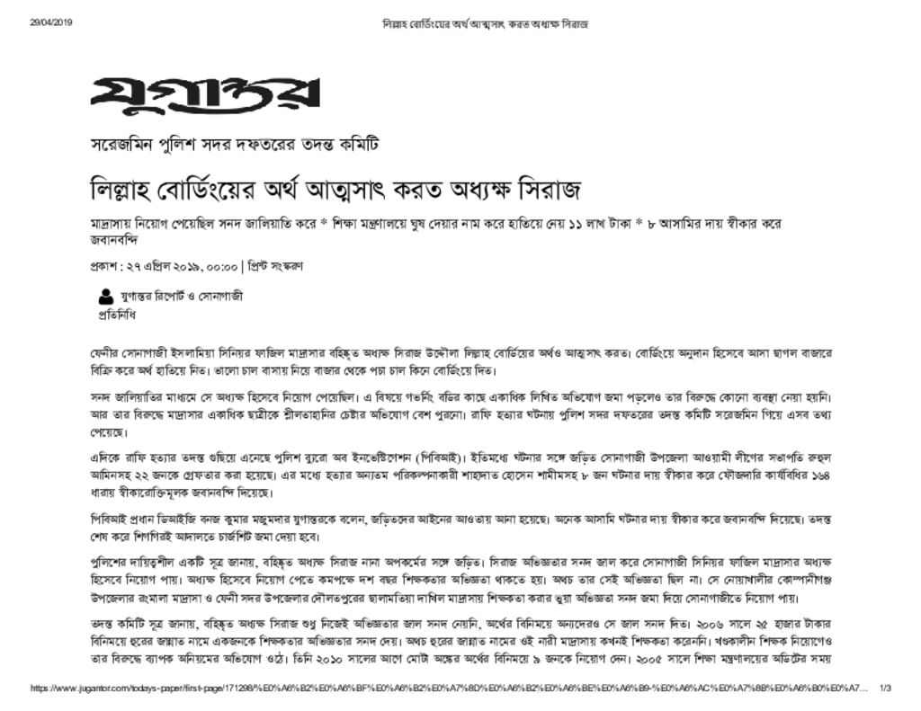 লিল্লাহ বোর্ডিংয়ের অর্থ আত্মসাৎ করত অধ্যক্ষ সিরাজ Published on Newspaper দৈনিক যুগান্তর Category Madrasah Education Download