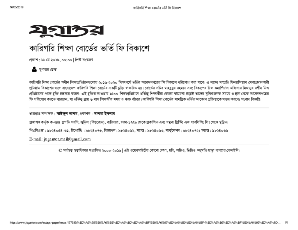 কারিগরি শিক্ষা বোর্ডের ভর্তি ফি বিকাশে Published on Newspaper দৈনিক যুগান্তর Category Technical and Vocational Education Admission/Seat Problem Download