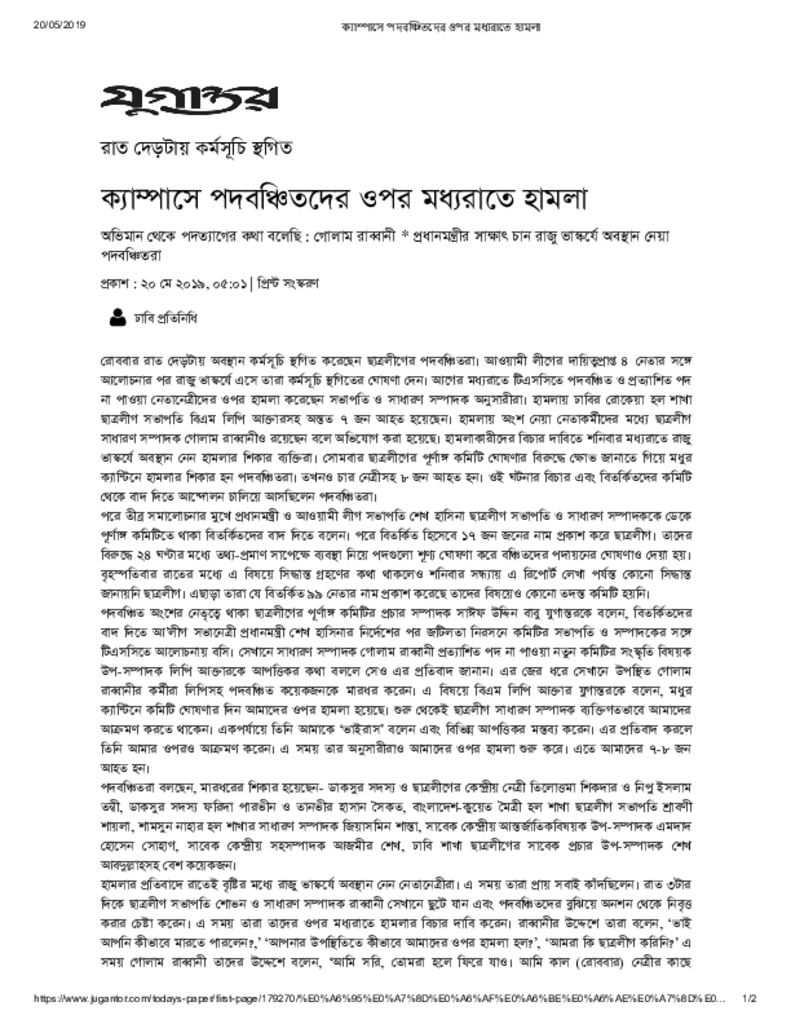 ক্যাম্পাসে পদবঞ্চিতদের ওপর মধ্যরাতে হামলা Published on Newspaper দৈনিক যুগান্তর Category Campus Terrorism Download