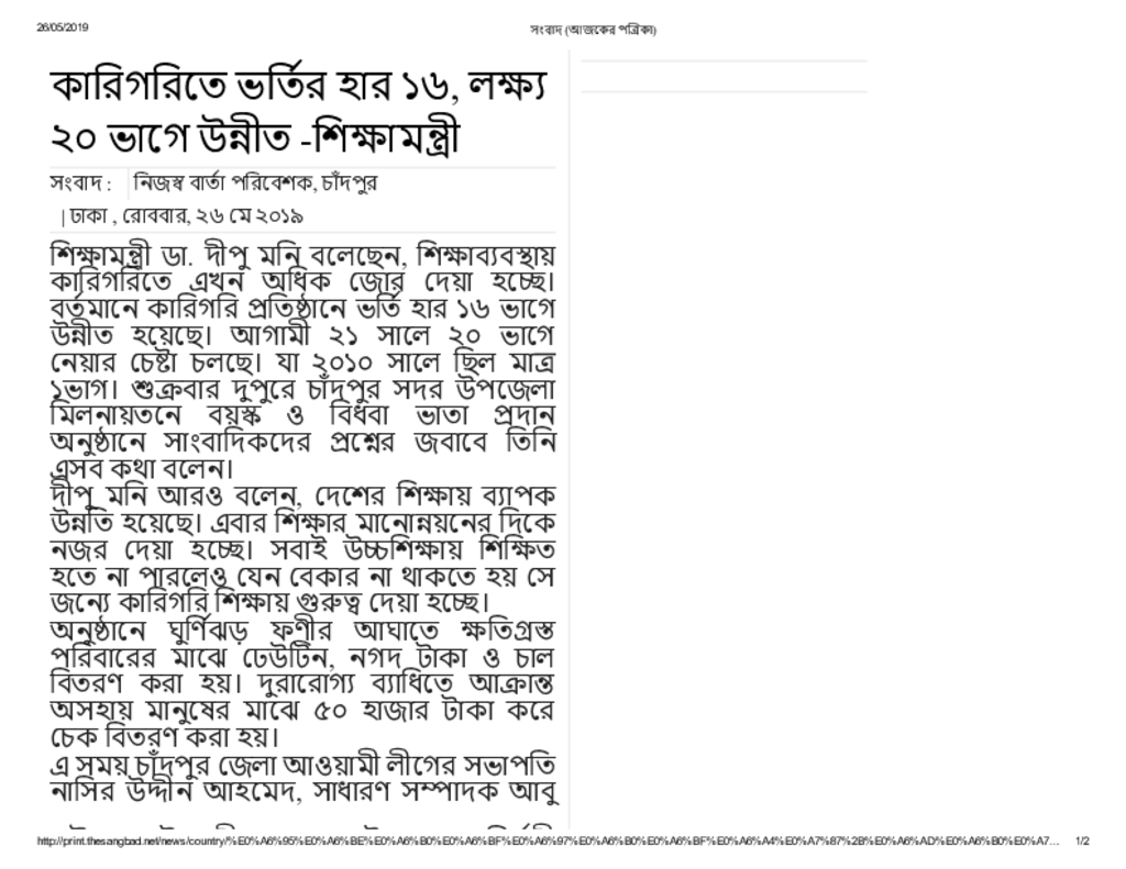 কারিগরিতে ভর্তির হার ১৬, লক্ষ্য ২০ ভাগে উন্নীত -শিক্ষামন্ত্রী Published on Newspaper দৈনিক সংবাদ Category Technical and Vocational Education Download