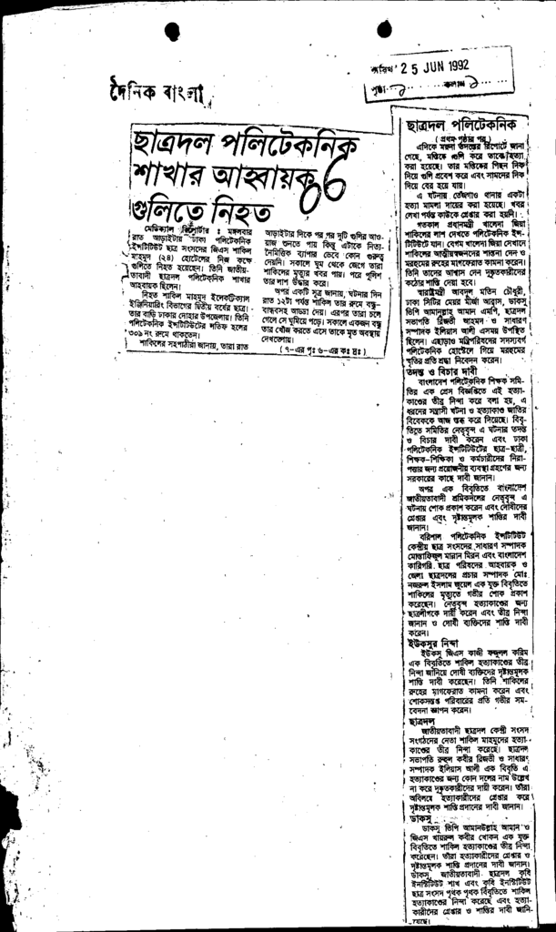 ছাত্র দল পলিটেকনিক শাখার আহবায়ক গুলিতে নিহত Published on Newspaper দৈনিক বাংলা Category Student Politics Download