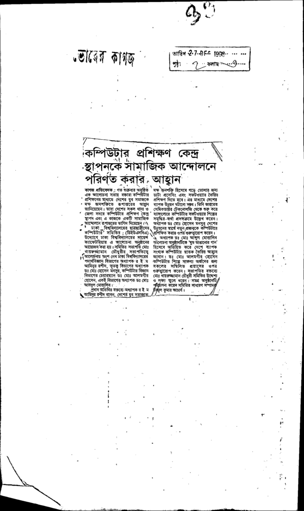 কম্পিউটার প্রশিক্ষণ কেন্দ্র স্থাপনকে সামাজিক আন্দোলনে পরিণত করার আহ্বান Published on Newspaper দৈনিক ভোরের কাগজ Category ICT Education Download
