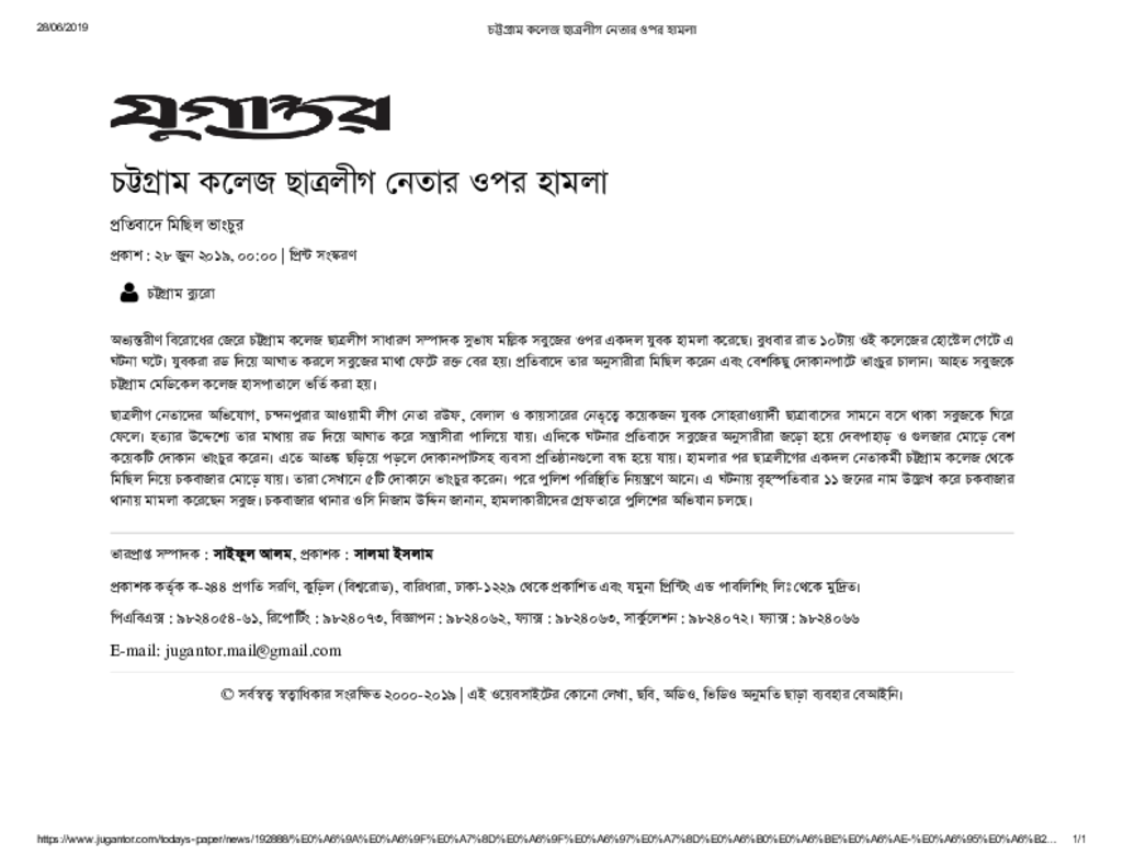 চট্টগ্রাম কলেজ ছাত্রলীগ নেতার ওপর হামলা Published on Newspaper দৈনিক যুগান্তর Category Campus Terrorism Download