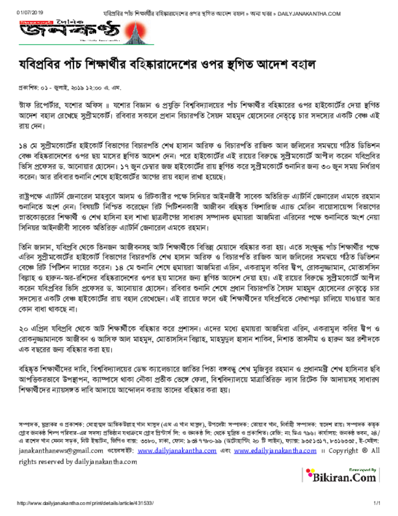 যবিপ্রবির পাঁচ শিক্ষার্থীর বহিষ্কারাদেশের ওপর স্থগিত আদেশ বহাল » অন্য খবর » DAILYJANAKANTHA.COM
